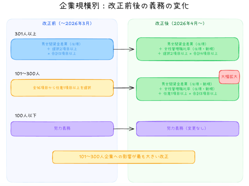 今回の改正の実務上の核心がこちらです。これまで従業員数301人以上の大企業にのみ義務付けられていた「男女間賃金差異」の公表が、101人以上の企業にも拡大されました。さらに新たに「女性管理職比率」の公表も、101人以上のすべての企業に義務付けられました。