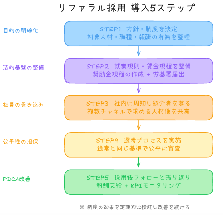 リファラル採用を自社で導入する際の基本的な手順を5つのステップで解説します。